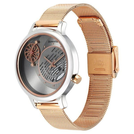 The latest Sonata watches for women in 2025 include elegant mesh strap designs, mother-of-pearl dials, and rose-gold metal strap models from the Poze and Unveil collections.