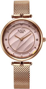 If you are a watch aficionado you will surely love this women's analog watch from the Raga Show Stooped collection by Titan. Operated by a quartz movement and safeguarded by a sapphire glass, the rose gold round dial is encased in a 36.2 mm case. It features plain three hands. The brass strap flaunts a rose gold hue that accentuates the look of the watch. Moreover, it is completed with a hook buckle clasp to ensure a secure fit on the wrist.