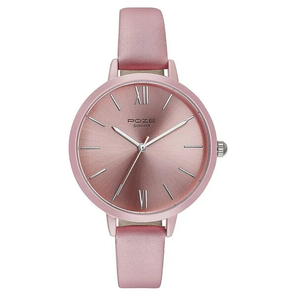 The Sonata Poze Quartz Analog Pink Dial Leather Strap Watch for Women is a stylish and elegant timepiece that combines a feminine design with reliable functionality. Here's an in-depth look at its features: