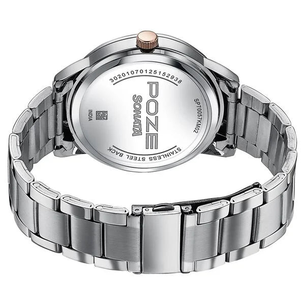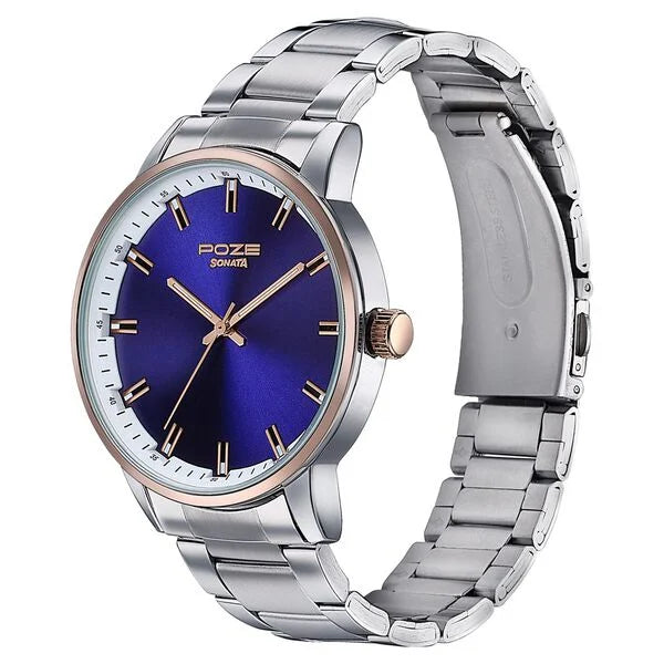 The Sonata Poze Quartz Analog Blue Dial Stainless Steel Strap Watch for Men (Model: SP70057KM02) is a stylish and budget-friendly timepiece from Sonata's Poze collection, designed to offer a blend of elegance and functionality.