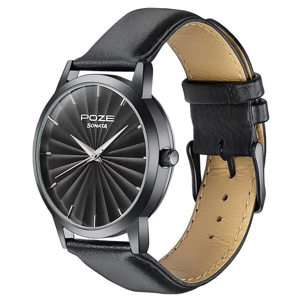 The Sonata Poze Quartz Analog Black Dial Leather Strap Watch for Men (Model: SP70065NL01) is a stylish and budget-friendly timepiece from Sonata's Poze collection, designed to offer a blend of elegance and functionality.