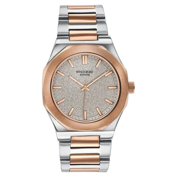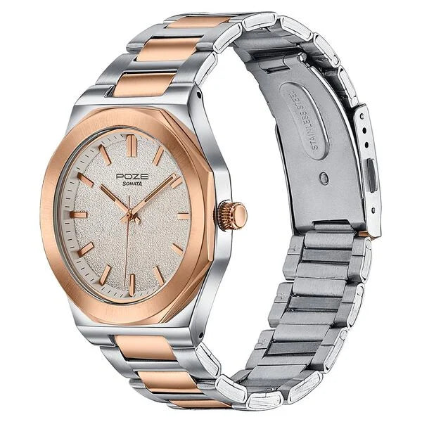 Sonata Poze Quartz Analog Beige Dial Two Toned Colour Stainless Steel Strap Watch For Men