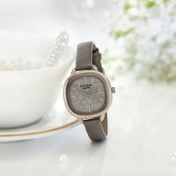 The Sonata Poze Quartz Analog Grey Dial Leather Strap Watch for Women is a beautiful and versatile timepiece that blends elegance with functionality. Here's a breakdown of its features: