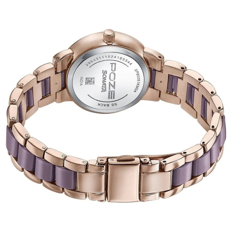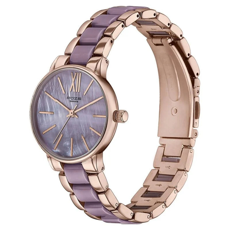 The Sonata Poze Quartz Analog Pink Dial Metal Strap Watch for Women is a stylish and feminine timepiece that combines a unique design with reliable functionality. Here's an overview of its key features: