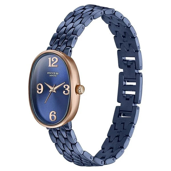The Sonata Poze Quartz Analog Blue Dial Metal Strap Watch for Women is a stylish and versatile timepiece designed to complement both casual and formal outfits. Here’s an in-depth look at its features: