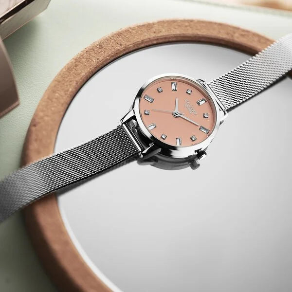 Dial: Pink Dial – The soft pink dial gives the watch a fresh, vibrant, and feminine look. Pink is a versatile color that pairs well with casual, semi-formal, or even some formal outfits, adding a playful yet sophisticated touch to any look.