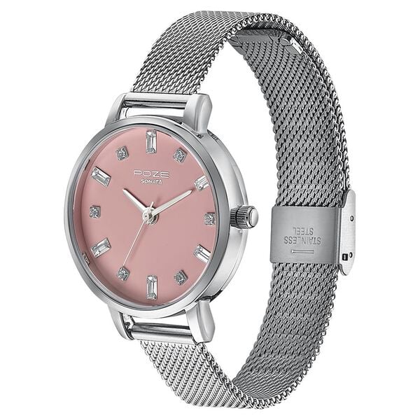 The Sonata Poze Quartz Analog Pink Dial Mesh Strap Watch for Women is a stylish and feminine timepiece that blends elegance with modern design. Here's an overview of its key features: