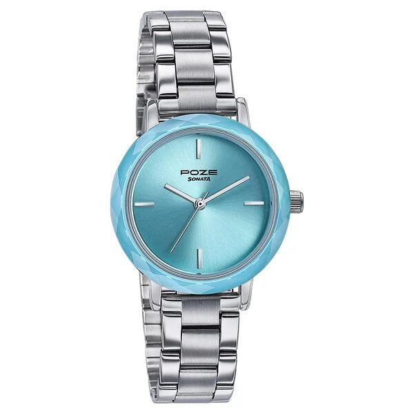The Sonata Poze Quartz Analog Blue Dial Stainless Steel Strap Watch for Women (Model: SP80099KM01) is a stylish and affordable timepiece from Sonata's Poze collection, designed to offer a blend of elegance and functionality.