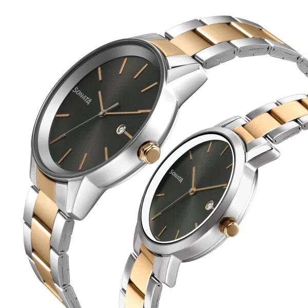 1. Sonata Quartz Analog with Date Black Dial Metal Strap Watch for Couple