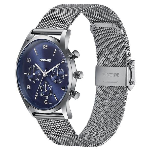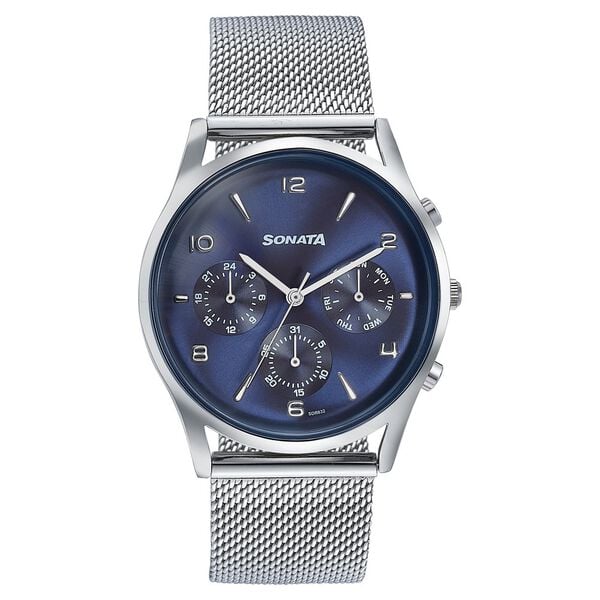 🕒 Sonata Wedding Edit Quartz Multifunction Blue Dial Stainless Steel Strap Watch for Men