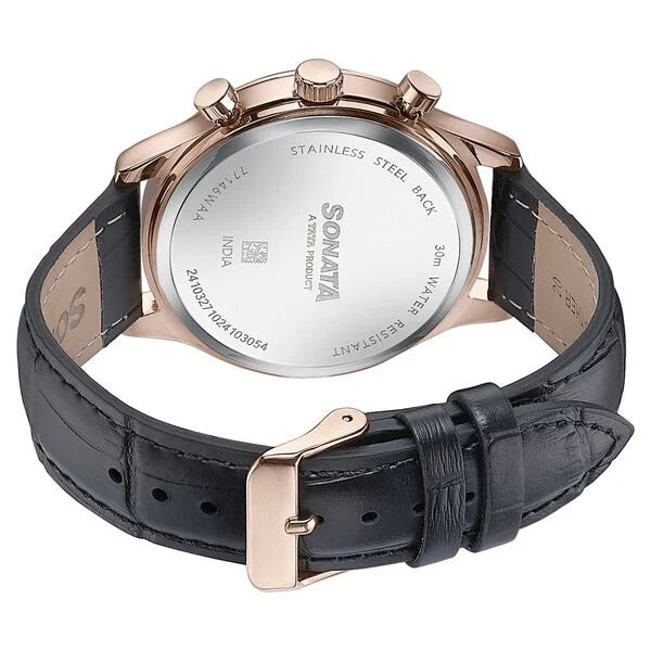 🕒 Sonata Wedding Edit Quartz Multifunction Black Dial Leather Strap Watch for Men