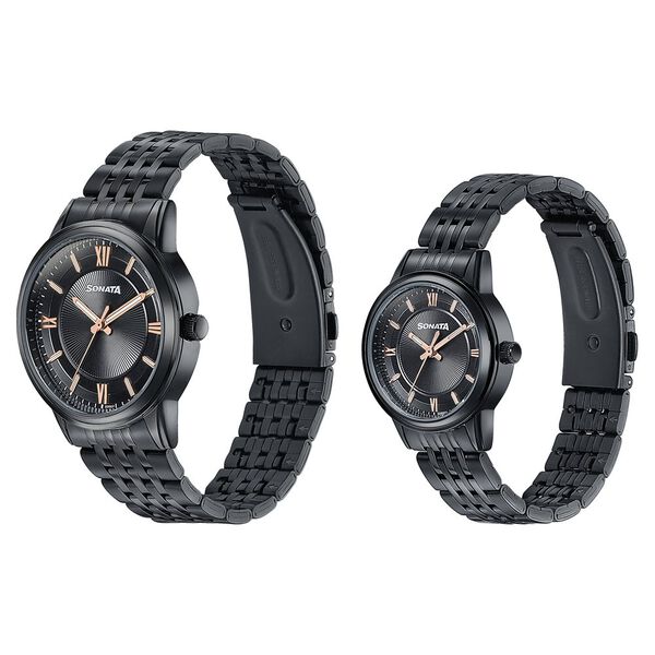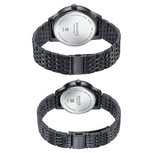 🕒 Sonata Wedding Edit Quartz Analog Black Dial Stainless Steel Strap Watch for Pair