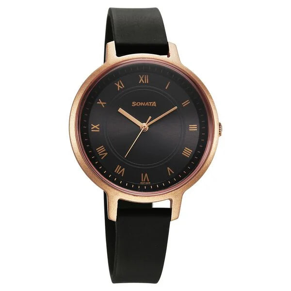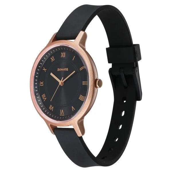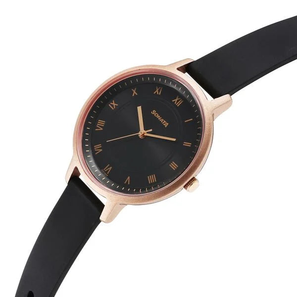 The Sonata Splash Quartz Analog Black Dial Plastic Strap Watch for women is a practical and stylish choice for those who prefer a casual, everyday watch. Here's a closer look at its features: