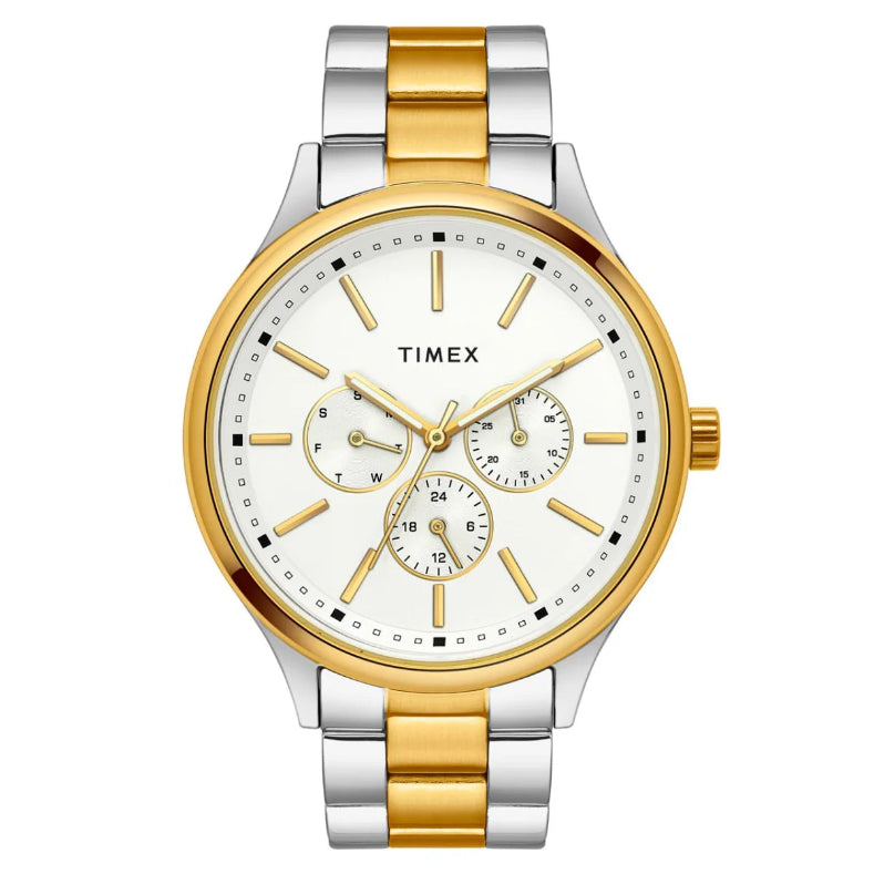 The Timex Men Multifunction White Round Brass Dial Watch - TWEG18424 is a stylish and functional timepiece with a clean, classic design. Here’s a breakdown of its features: