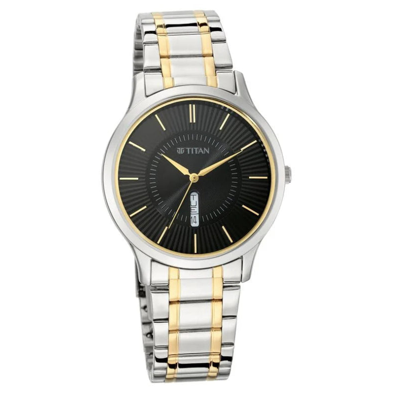 The Titan Quartz Analog with Day and Date Black Dial Metal Strap Watch for Men is a solid choice with a sleek, modern vibe. The black dial creates a bold and timeless look, while the day and date functionality adds practicality to the design. The metal strap offers durability and a polished finish, making it versatile for both casual and formal occasions.